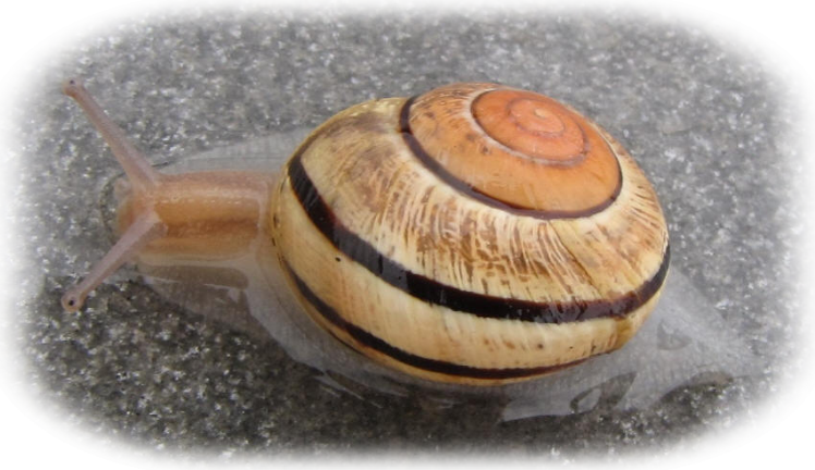 Das varias especies de caracois terrestres que forman parte da fauna do Baixo Miño, este, o Cepaea hortensis, é un dos máis fermosos, sobre todo certos exemplares que realzan os seus debuxos, como este da fotografía da dereita que mesmo parece que debuxaramos a man alzada esa liña negra que bordea xustamente as suturas das espirais que o conforman.